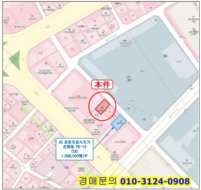 본건은 대전광역시 중구 선화동에 소재하는 "대전여자상업고등학교" 남서측 인근에 위치하는 부동산으로서, 본건 주변은 주상용시설, 주거용시설, 업무용시설, 학교 등이 혼재하는 지역임.